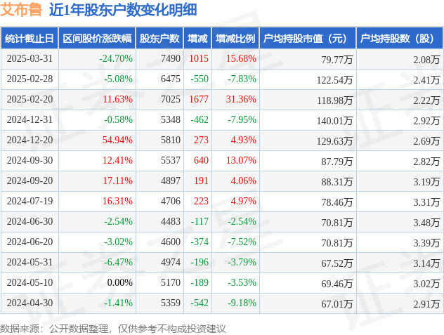 从股价来看,2025年2月28日至2025年3月31日,艾布鲁区间跌幅为24.7%,在此期间股东户数增加1015.0户,增幅为15.68%。