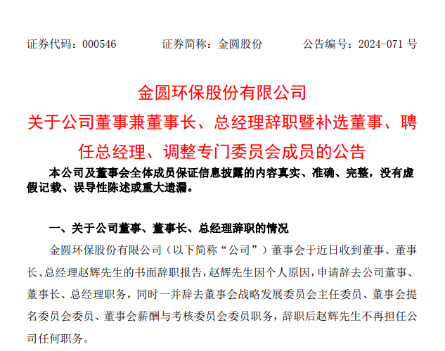 2024年9月,赵辉因个人原因辞去金圆股份董事、董事长、总经理职务,一并辞去董事会战略发展委员会主任委员、董事会提名委员会委员、董事会薪酬与考核委员会委员职务。辞职后,赵辉不再担任金圆股份的任何职务。