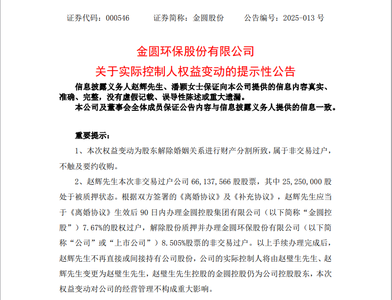 根据《离婚协议》等文件约定,赵辉拟将所持金圆股份8.505%的股权、金圆股份控股股东金圆控股集团有限公司(以下简称金圆控股)7.67%的股权,均转让至潘颖名下。