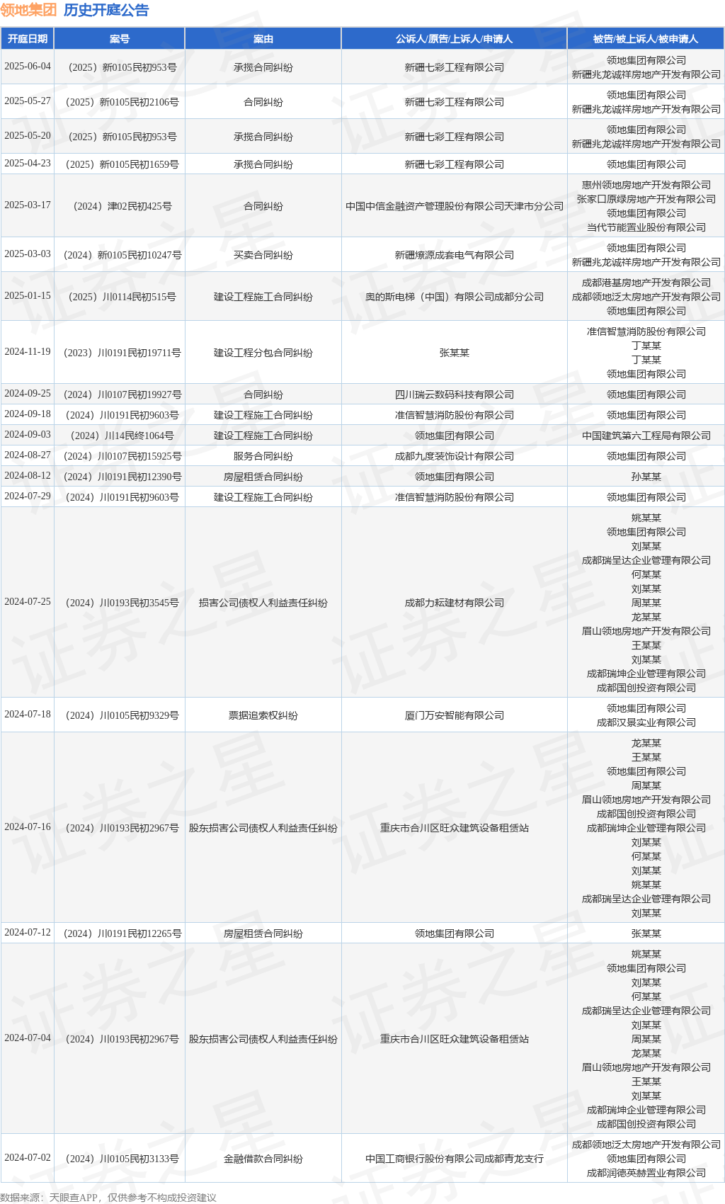 案号:(2025)新0105民初953号审理法院:乌鲁木齐市水磨沟区人民法院案由:承揽合同纠纷当事人信息: 原告/上诉人:新疆七彩工程有限公司 被告/被上诉人:领地集团有限公司、新疆兆龙诚祥房地产开发有限公司开庭日期:2025年6月4日根据统计,近一年内以领地集团有限公司为当事人的历史开庭公告有23则,其中案由为“建设工程施工合同纠纷”的公告以5则居首,其次为“合同纠纷”有3则,“承揽合同纠纷”有3则。历史开庭公告(前20条)如下:
