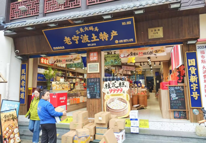 在宁波鼓楼古色古香的街巷里,一家名为“三关六码头”的特产店门前,市民游客络绎不绝。这里的油赞子、古法烤糖、三北豆酥糖汤果糕、非遗黄油酥饼、非遗油焖笋等都是常年的热销单品。