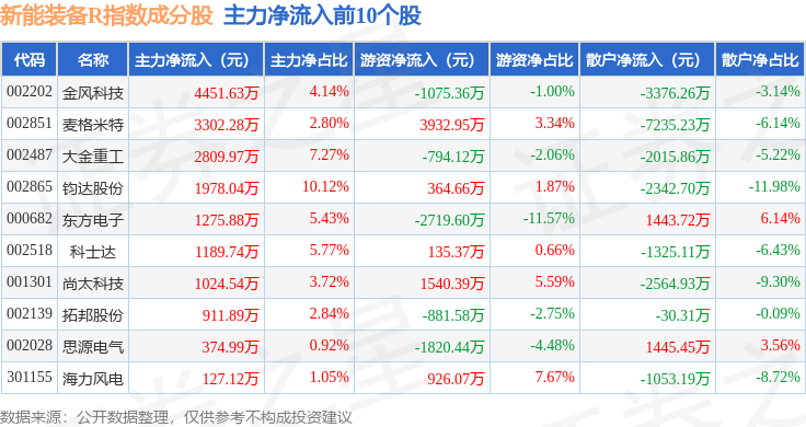 资金流向方面,新能装备R(470043)指数成份股当日主力资金净流出合计8.41亿元,游资资金净流出合计4328.38万元,散户资金净流入合计8.84亿元。成份股资金流向详情见下表: