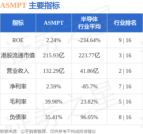 ASMPT港股市值215.93亿港元,在半导体行业中排名第3。主要指标见下表: