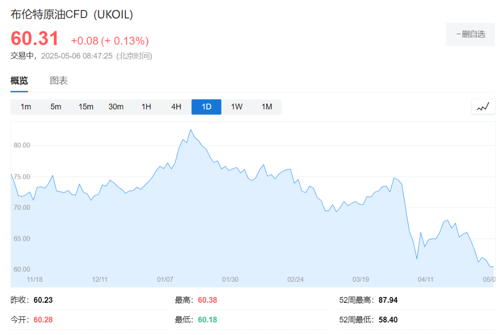 由于特朗普关税政策不确定性引发原油需求担忧加剧,再加上供应的增加,油价遭遇重击,布伦特原油已跌至四年来的最低点。5月5日,国际油价继续大幅下跌,布伦特原油一度跌破60美元/桶关口,WTI原油则逼近57美元/桶,均创下四年以来的新低。