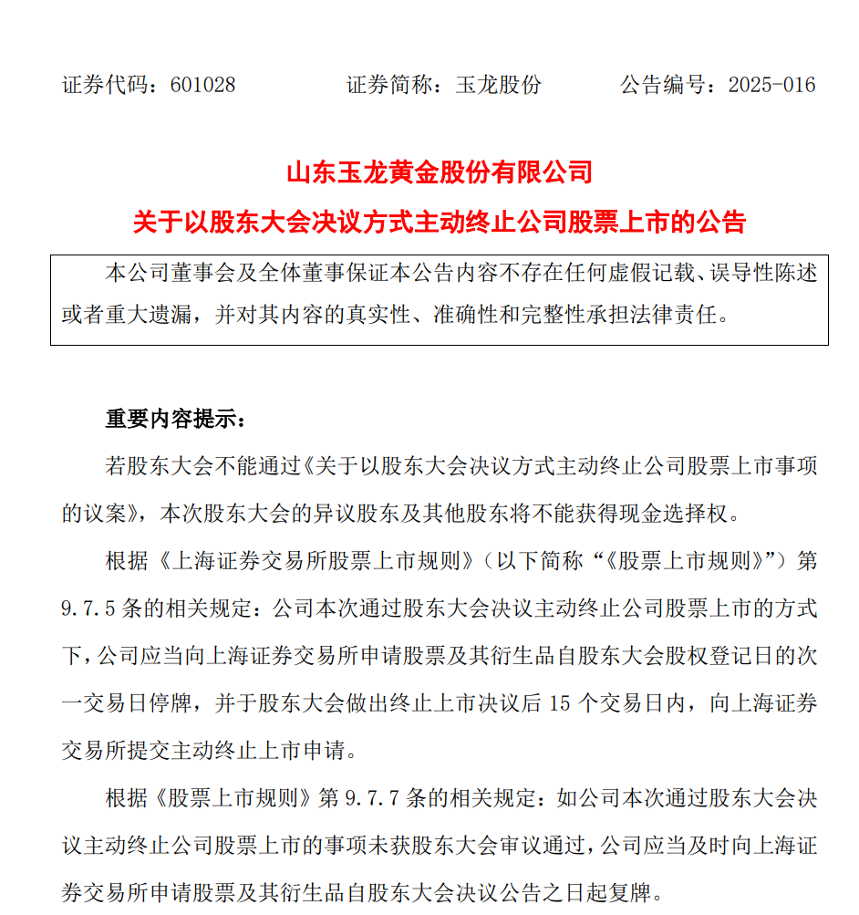 昨日晚间,黄金概念股玉龙股份(601028)公告称,由于经营状况不佳、现金流持续恶化,公司经营面临重大不确定性十大证券公司,为保护中小股东利益,拟主动撤回A股股票在上交所的上市交易。本议案尚需提交公司股东大会审议。股东大会审议通过后,本次终止上市尚需获得上海证券交易所的同意。